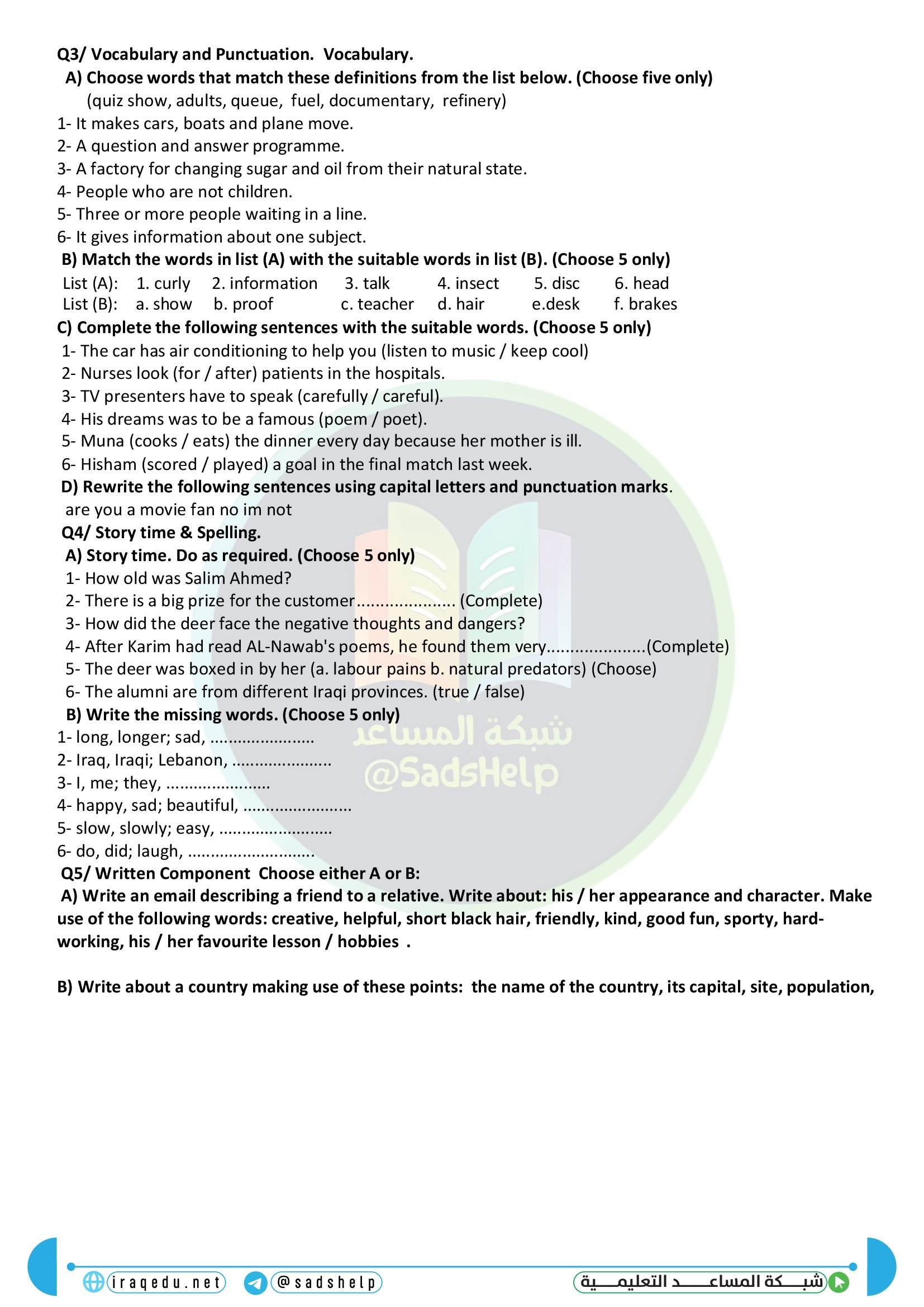 اسئلة الانكليزي التمهيدي الثالث المتوسط 2019