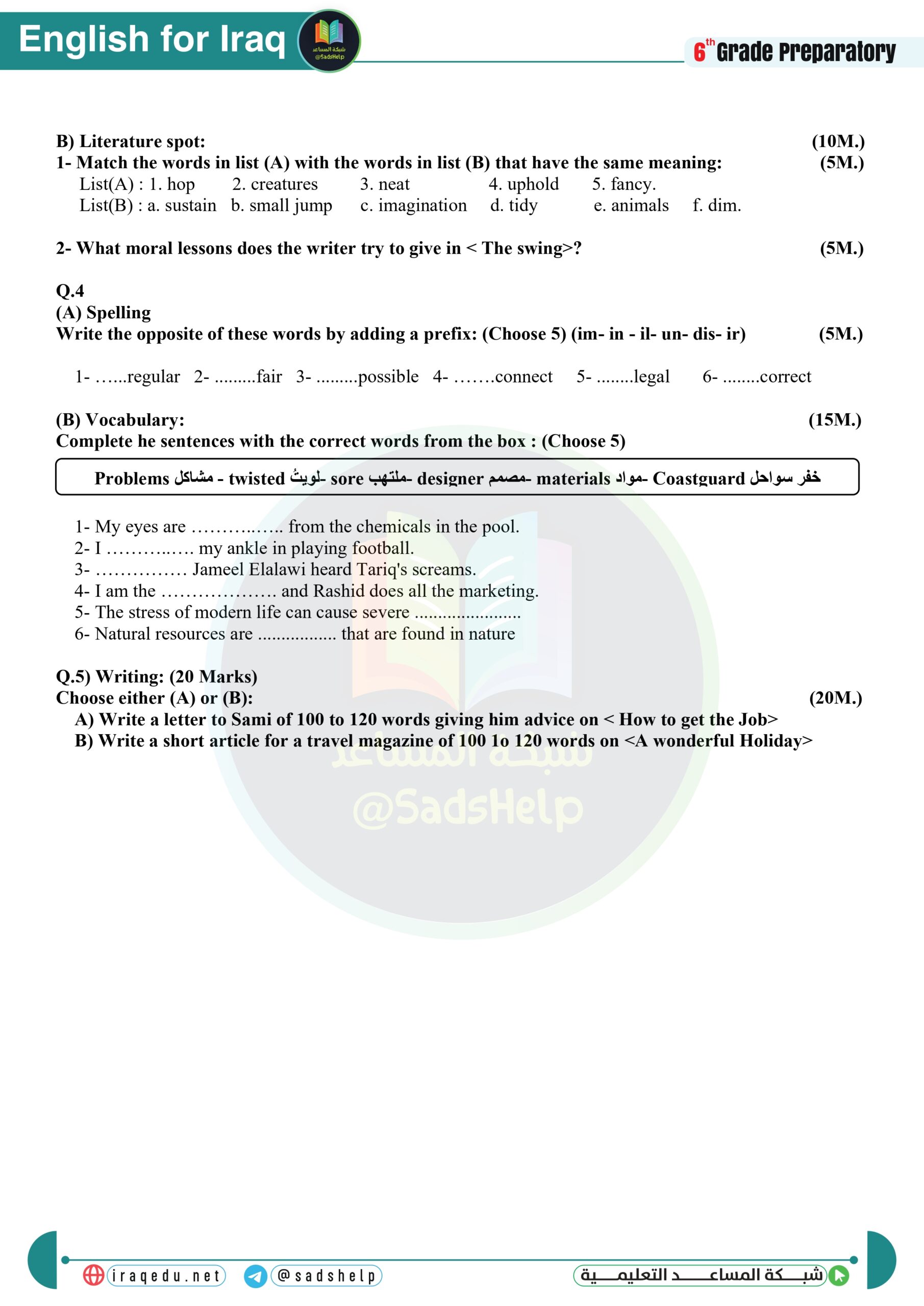 • اسئلة الانكليزي الدور الاول السادس الاعدادي 2015 العلمي و الادبي النازحين