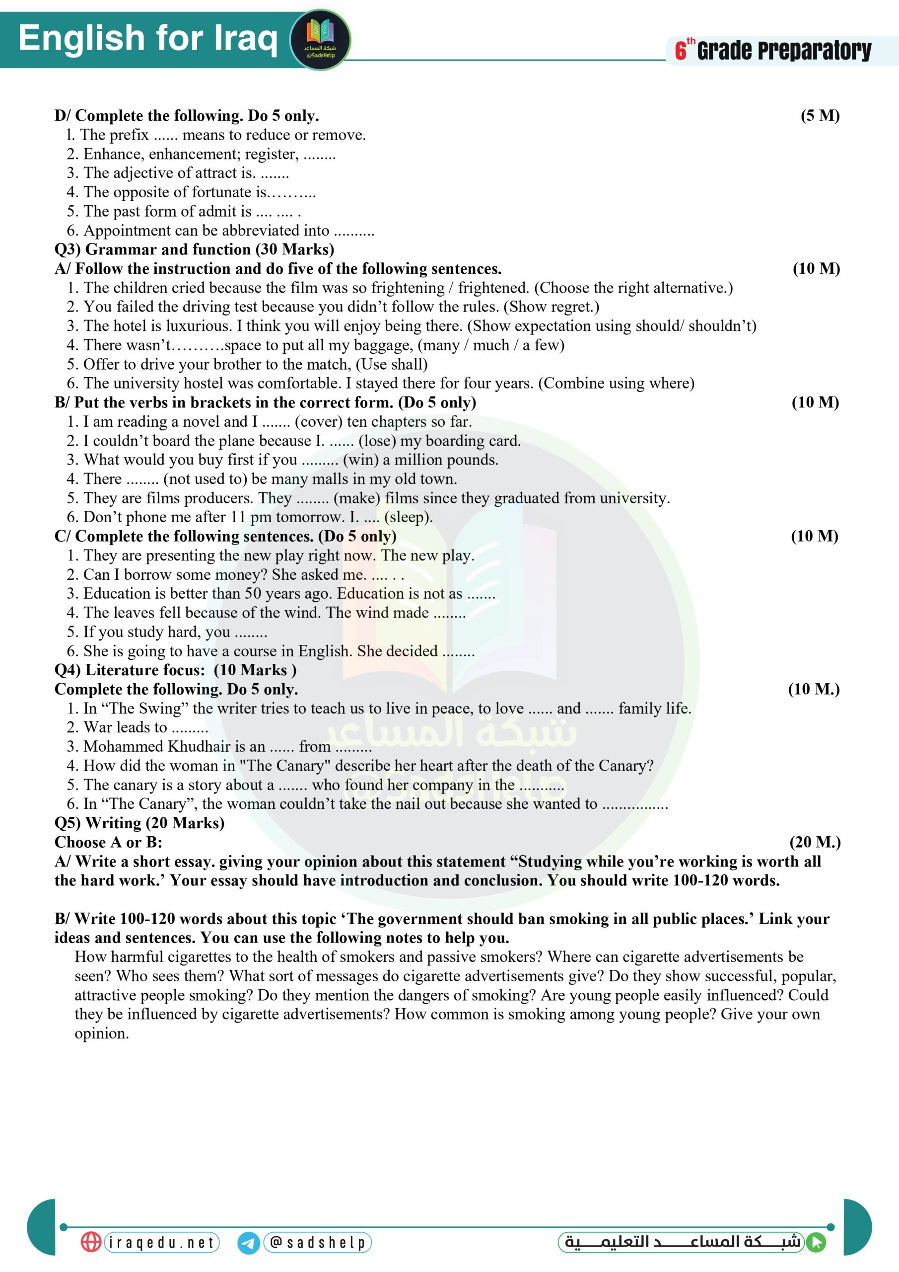• اسئلة الانكليزي الدور الاول السادس الاعدادي 2015 العلمي و الادبي النازحين