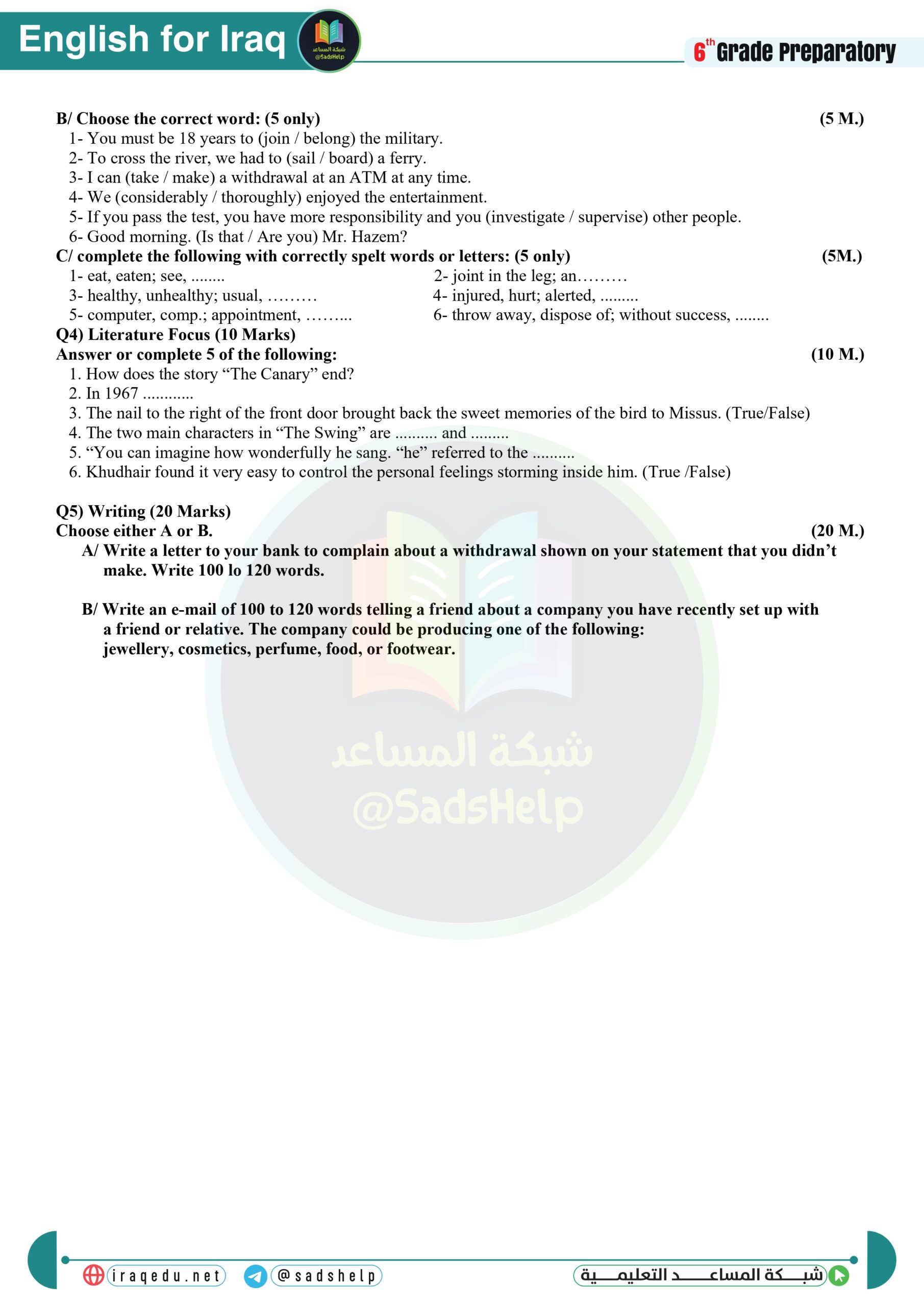 • اسئلة الانكليزي الدور الثالث السادس الاعدادي 2023 العلمي و الادبي التكميلي