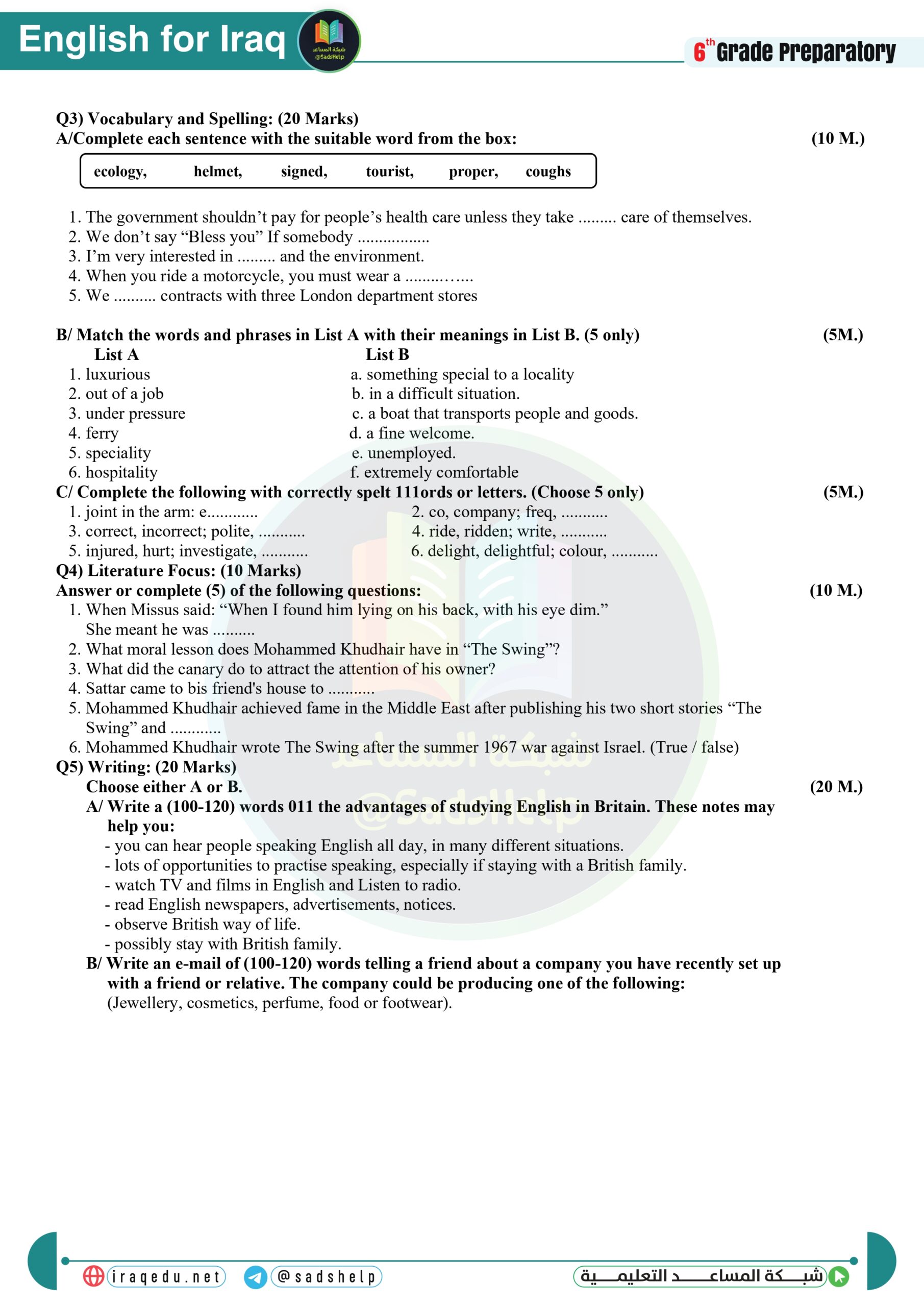 • اسئلة الانكليزي الدور الثاني السادس الاعدادي 2018 العلمي و الادبي خارج القطر