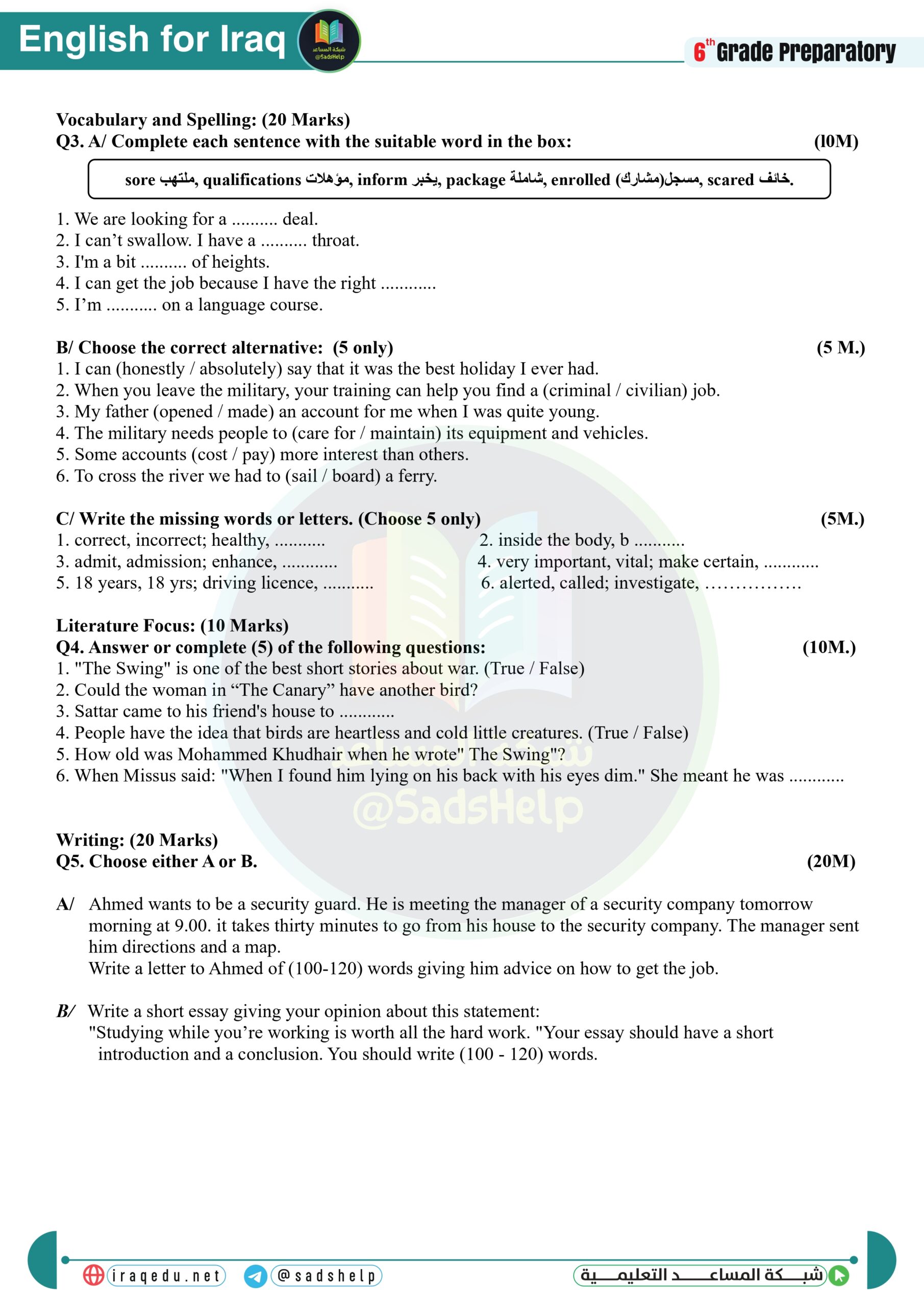 • اسئلة الانكليزي الدور الثاني السادس الاعدادي 2018 العلمي و الادبي خارج القطر
